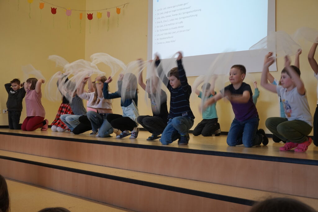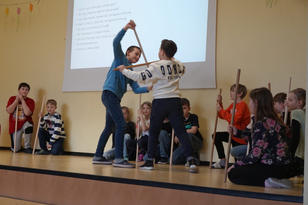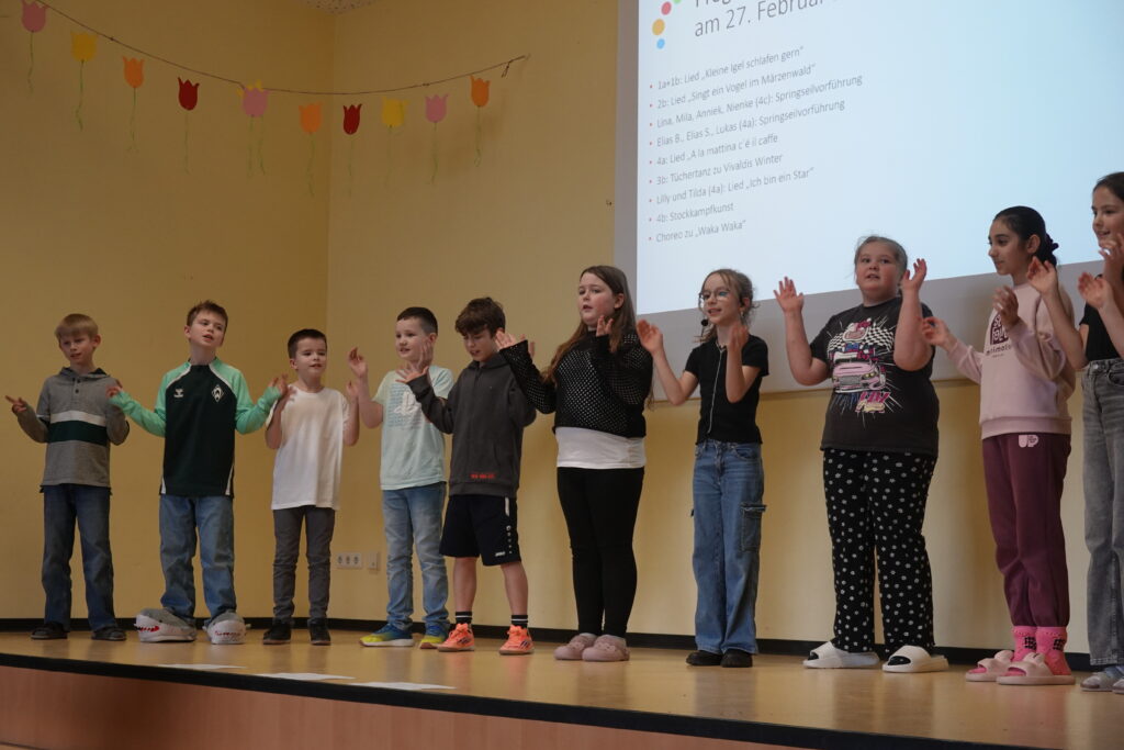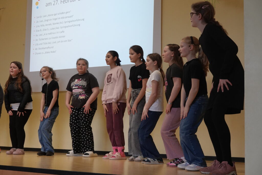 Unser erstes Forum in diesem Jahr war ein bunter Mix aus Liedern, Tänzen und sportlichen Darbietungen, die man bisher noch nicht auf unserer PAula-Bühne gesehen hat. Aus den 4. Klassen zeigten einige Kinder tolle Übungen mit dem Springseil und die Klasse 4b hat die Zuschauer mit ihrer Stockkampfkunst beeindruckt. Die Erstklässler starteten das Forum mit einem Lied über Igel im Winterschlaf und auch die Kinder aus den Klassen 2a und 4a haben gesungen, die Viertklässler sogar auf italienisch. Die Klasse 3b zeigte einen schönen Tüchertanz zu der Musik von Vivaldis Winter und einen besonderen Auftritt hatten Tilda und Lilly aus der 4. Klasse, die einen Song alleine eingeübt und auf der Bühne gesungen haben. Zum Abschluss wurde mit dem ganzen Publikum noch einmal die Choreographie wiederholt, die auf der Rosenmontagsfeier mit allen Kindern und Erwachsenen gemeinsam getanzt wurde.